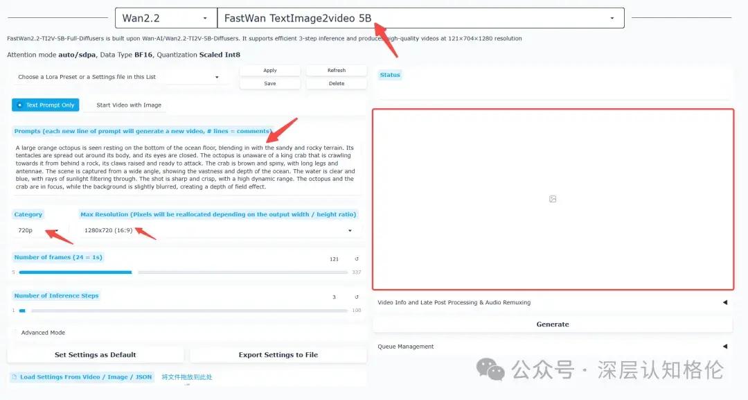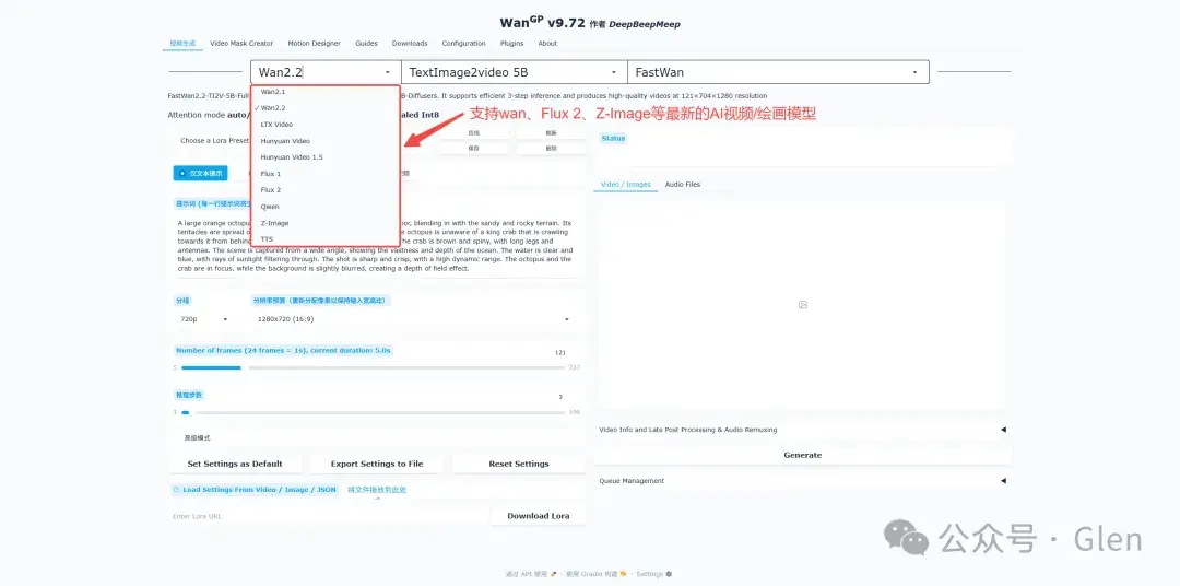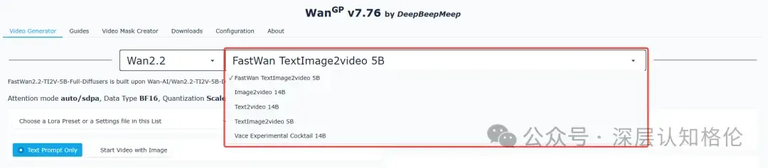 界面分提示词输入、参数调节、结果展示三区,启动即能用,使用 Wan2GP 时,根据需求点击最上方的模型列表,切换要用的模型。